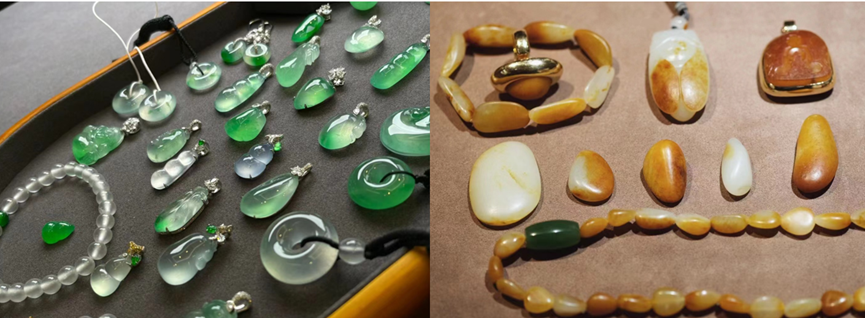Jadeite: When appreciating Jadeite, the focus is on its translucency, luster, vivid color, and fine texture. The best Jadeite pieces are clear, glossy, brightly colored, and densely structured without visible inclusions. Jadeite’s aesthetic appeals to modern, commercial tastes, often making it a standout piece meant to attract attention.