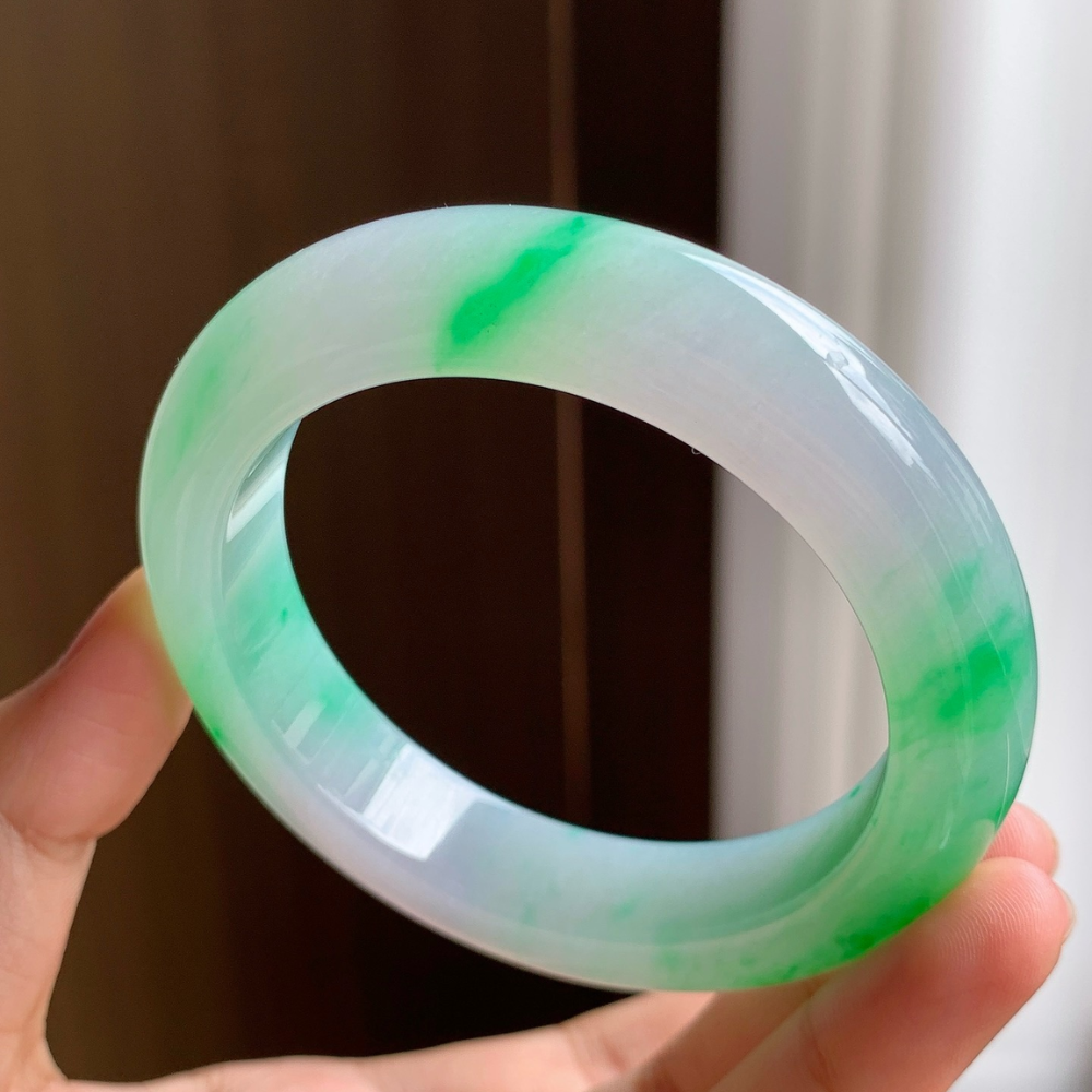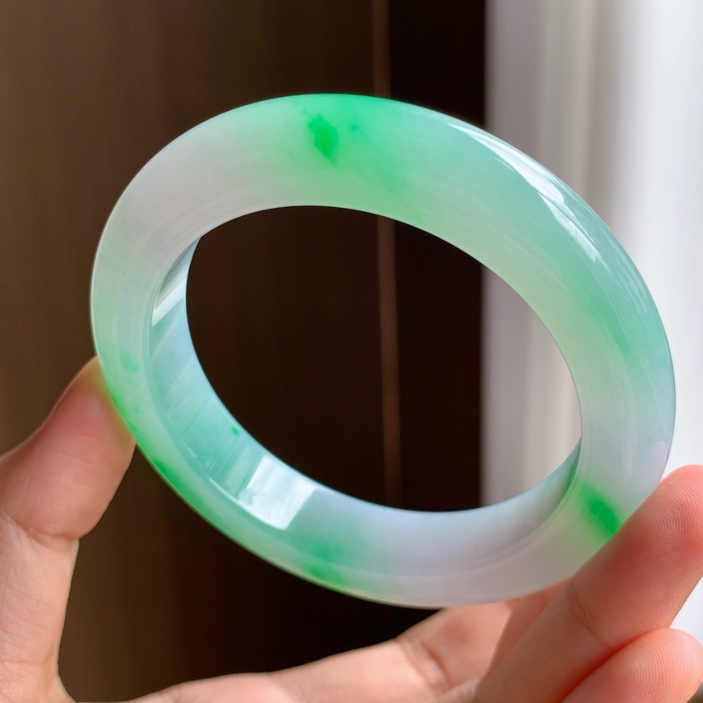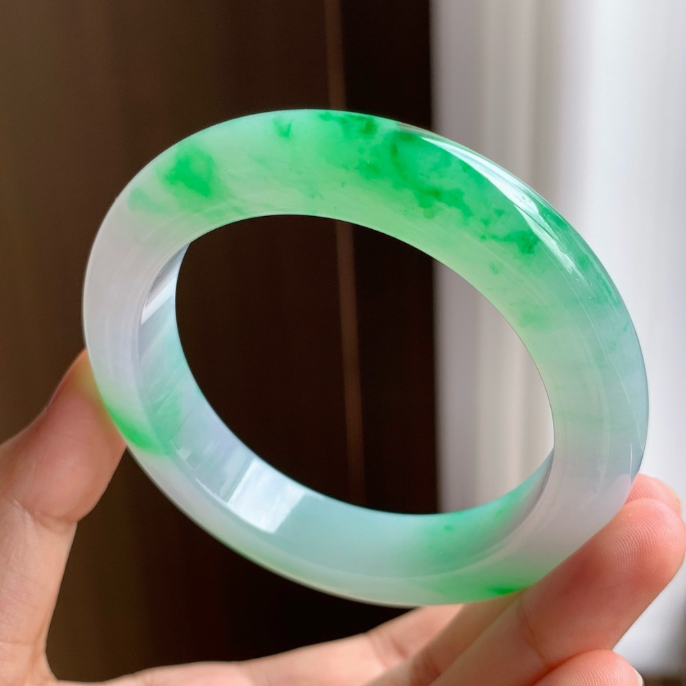 Description: This exquisite jadeite bangle features a delicate white base, with nearly half of the circle with beautifully floating green hues. The bright, vibrant greens sway like willows in the wind, exuding vitality and charm. This flawless piece showcases the highest quality craftsmanship, making it an eye-catching standalone accessory for daily wear or a stunning addition to any collection.