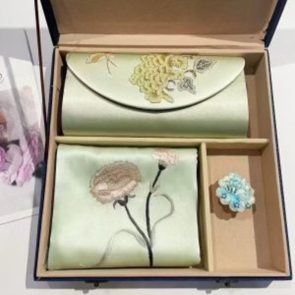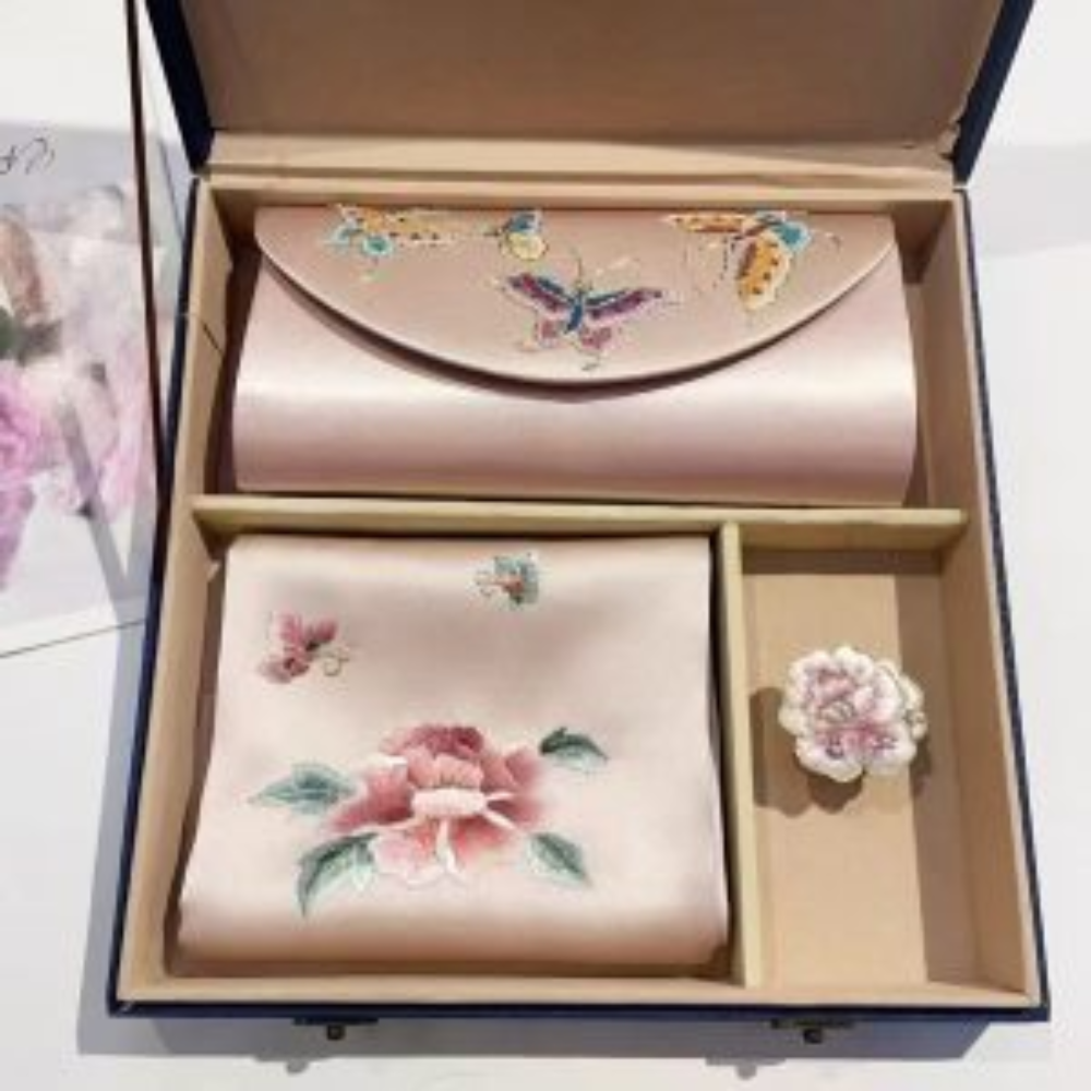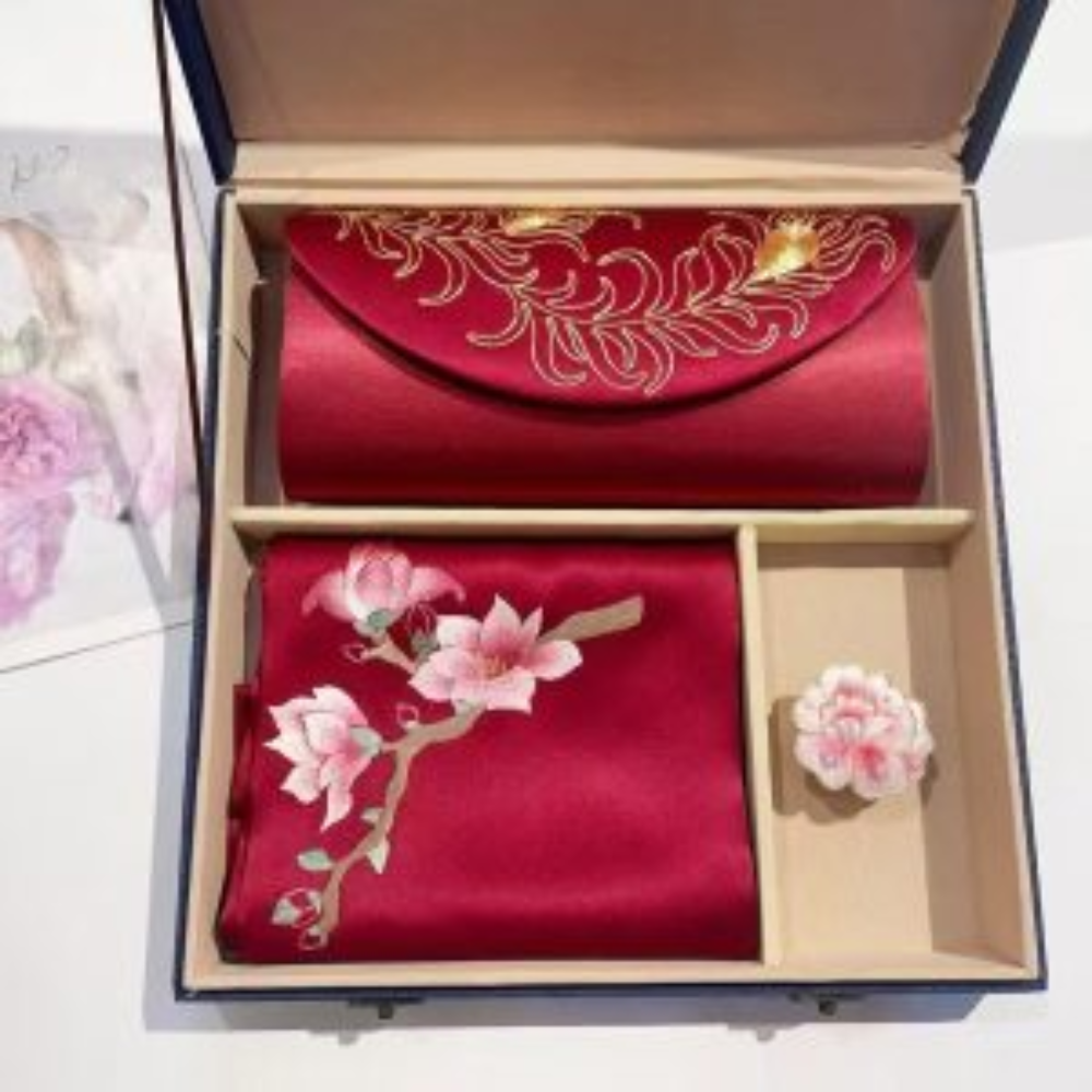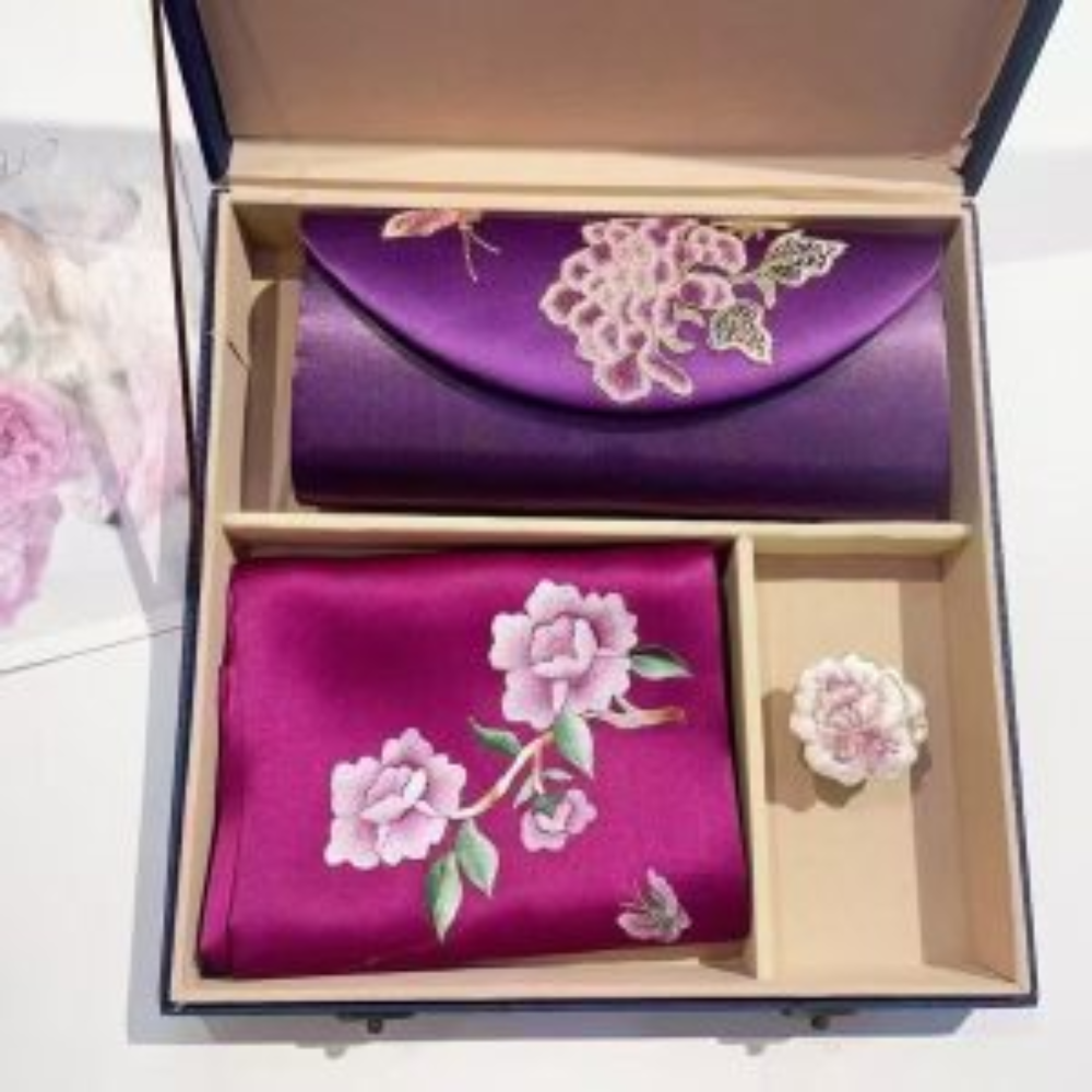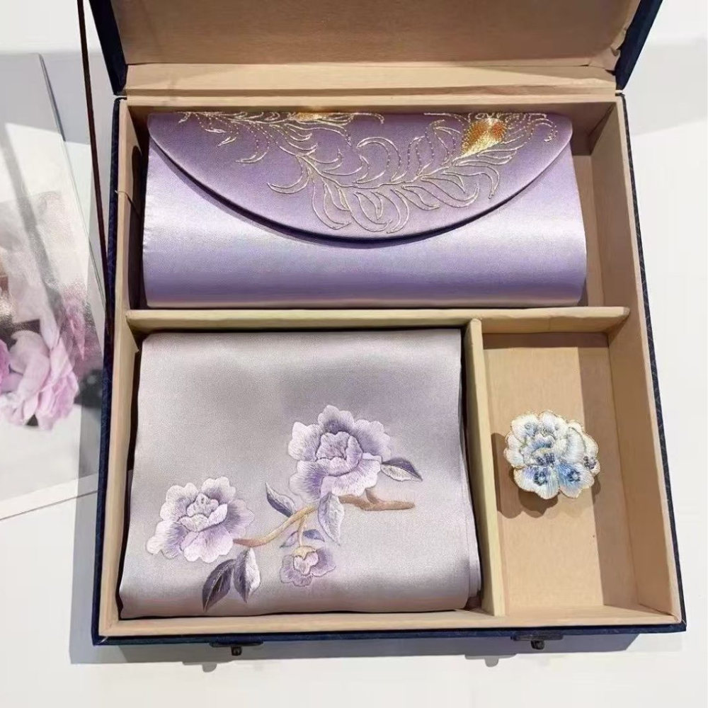 The scarf showcases intricate hand-embroidery, adding elegance to any ensemble, while the sleek, refined clutch offers both style and functionality. Presented in an elegant gift box, it’s the perfect choice for special occasions or as a high-end gift.