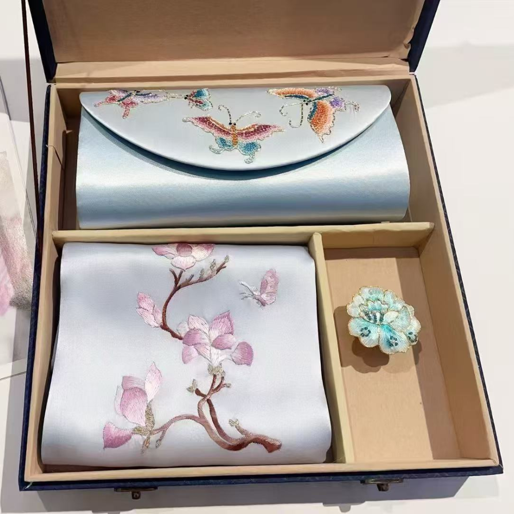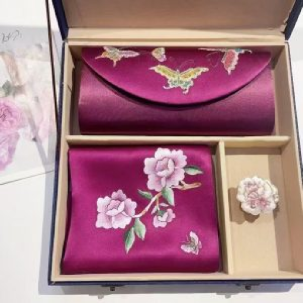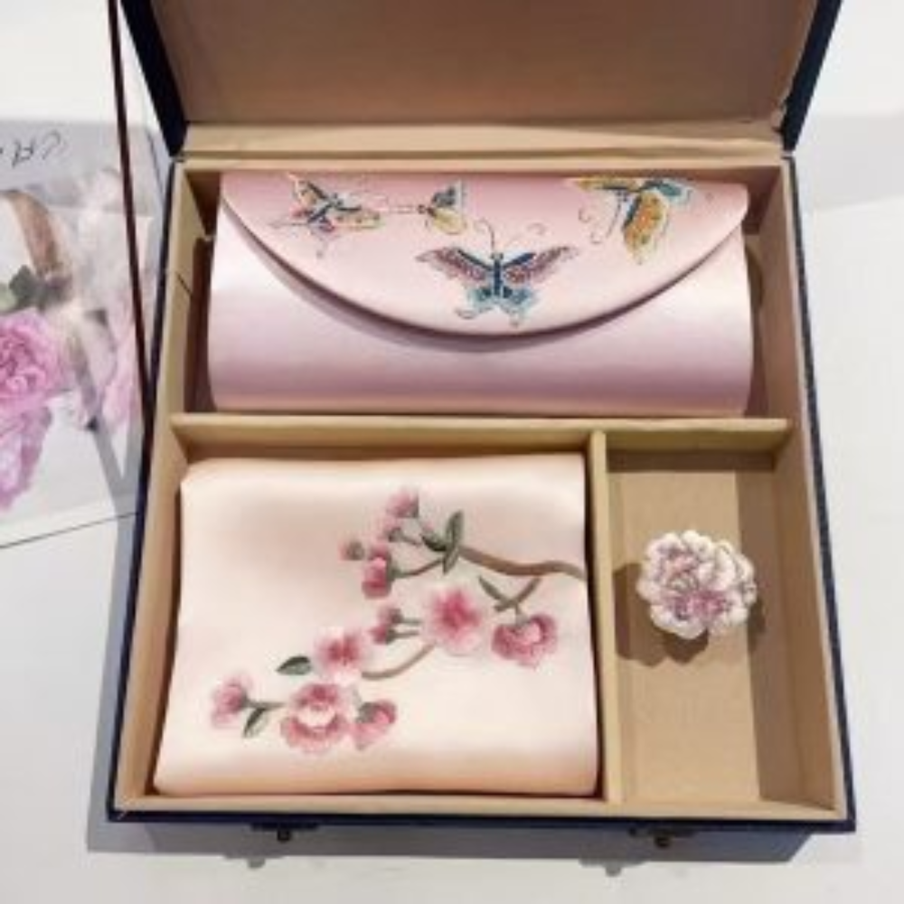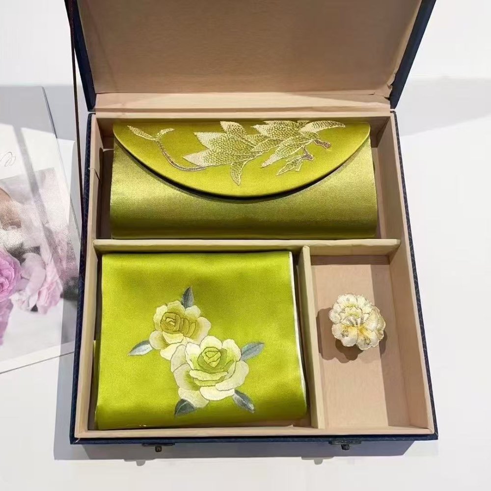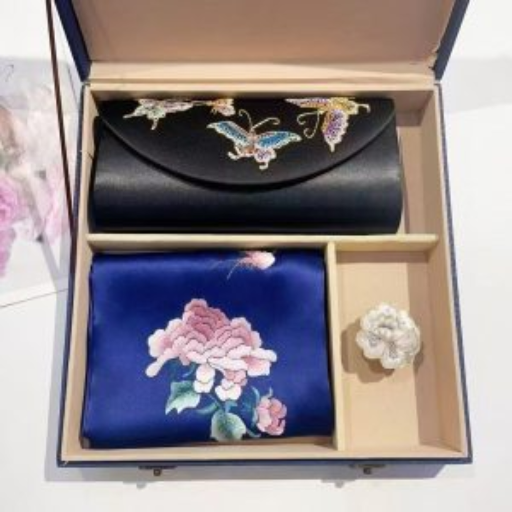 The scarf showcases intricate hand-embroidery, adding elegance to any ensemble, while the sleek, refined clutch offers both style and functionality. Presented in an elegant gift box, it’s the perfect choice for special occasions or as a high-end gift.