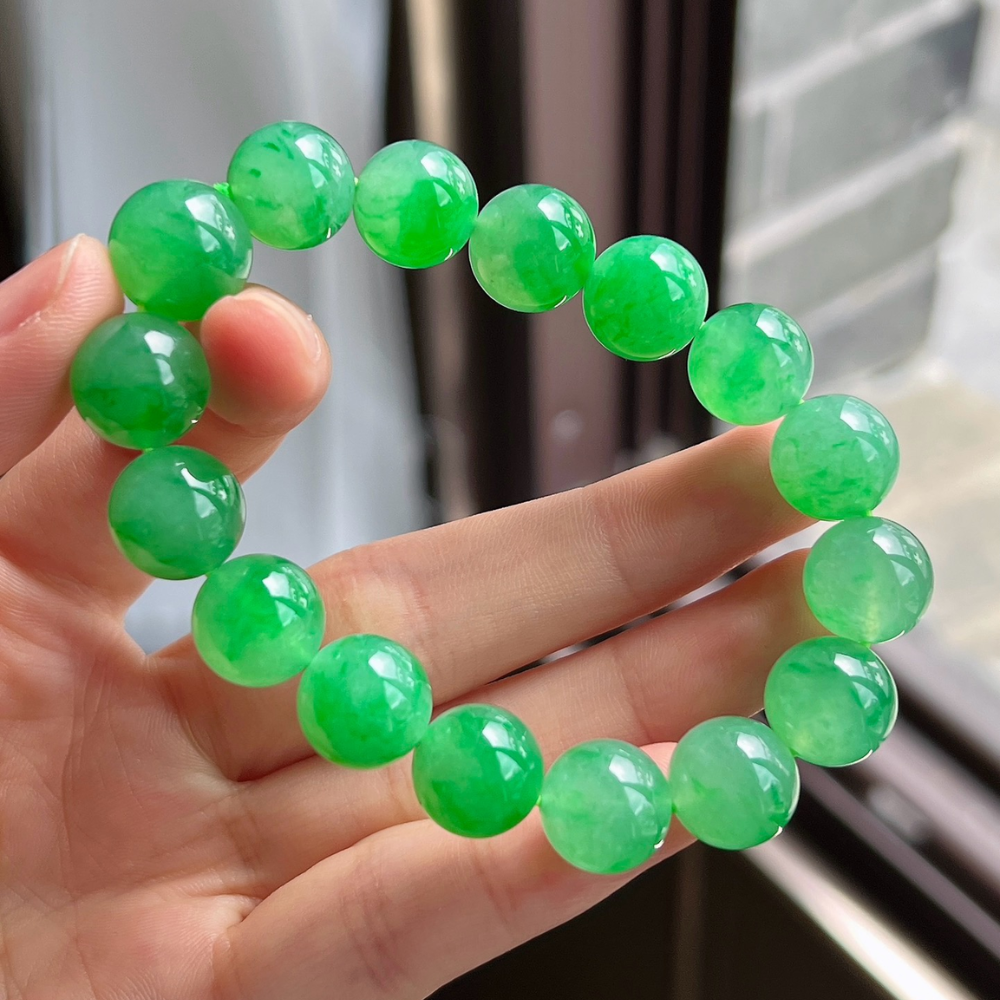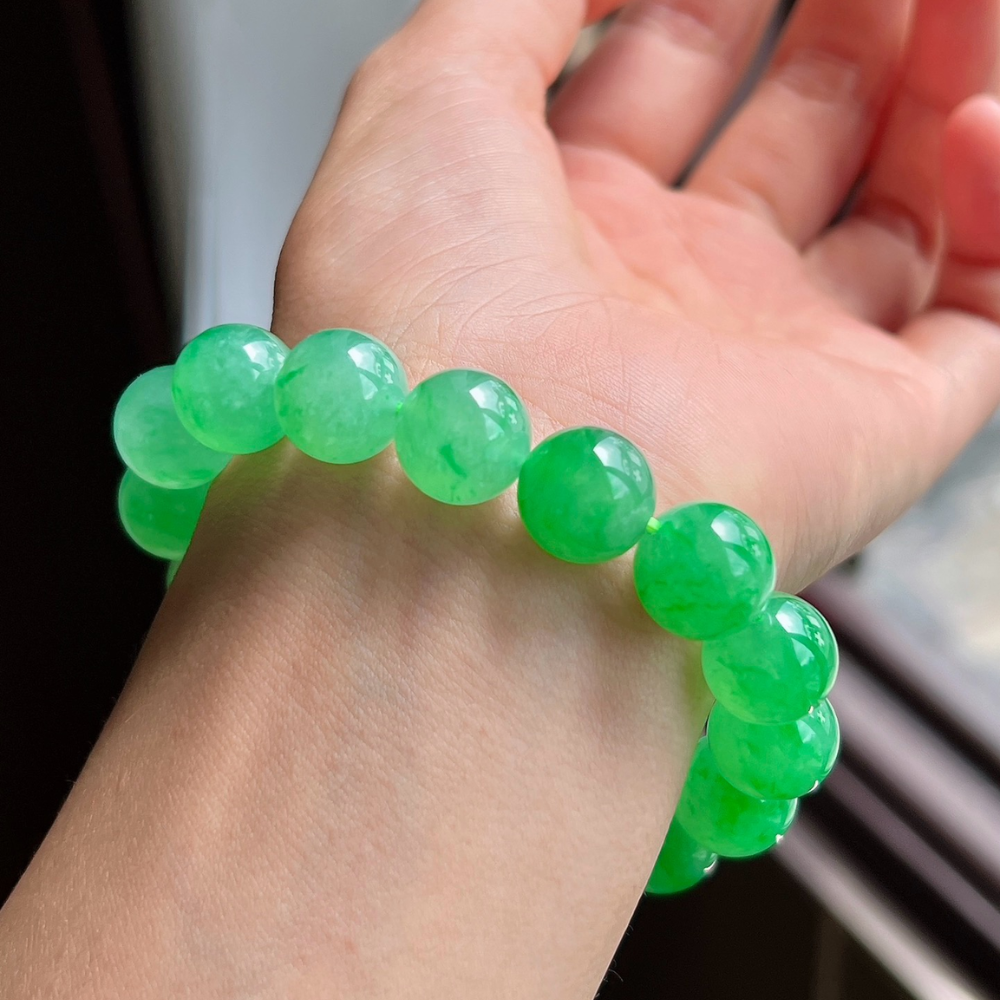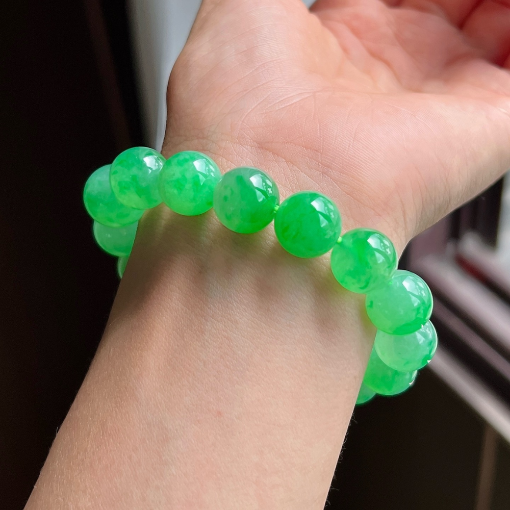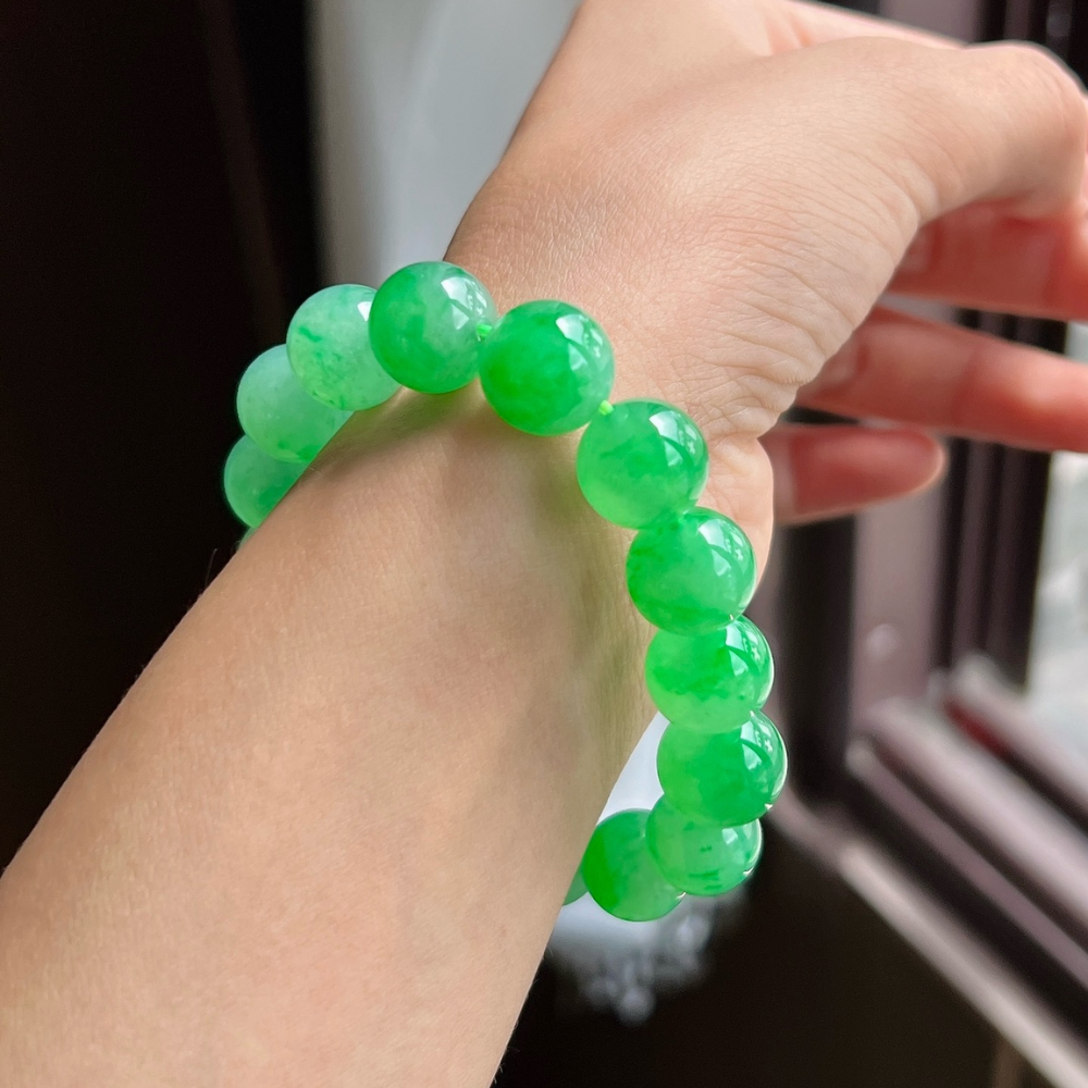 Description: Experience the captivating allure of our Icy Vibrant Green Round Bead Jadeite Bracelet. Crafted from top-grade bright green jadeite, each bead showcases a stunning natural floating flower phenomenon, highlighting the exceptional beauty of nature. The vibrant green hue is both refreshing and rich, evoking the invigorating spirit of early spring. This grand and refined piece transcends mere accessory status; it is a true testament to nature’s artistry. With its generous bead size, this bracelet is a valuable addition to any high-end collection and an essential treasure for jadeite lovers, embodying sophistication and the unique charm of jadeite’s finest qualities.