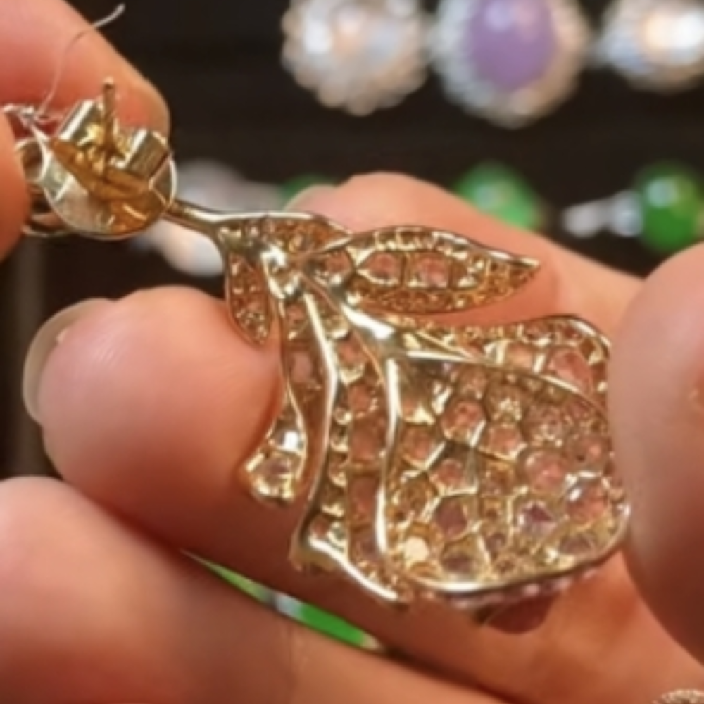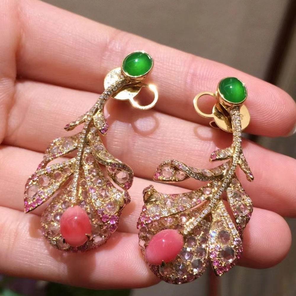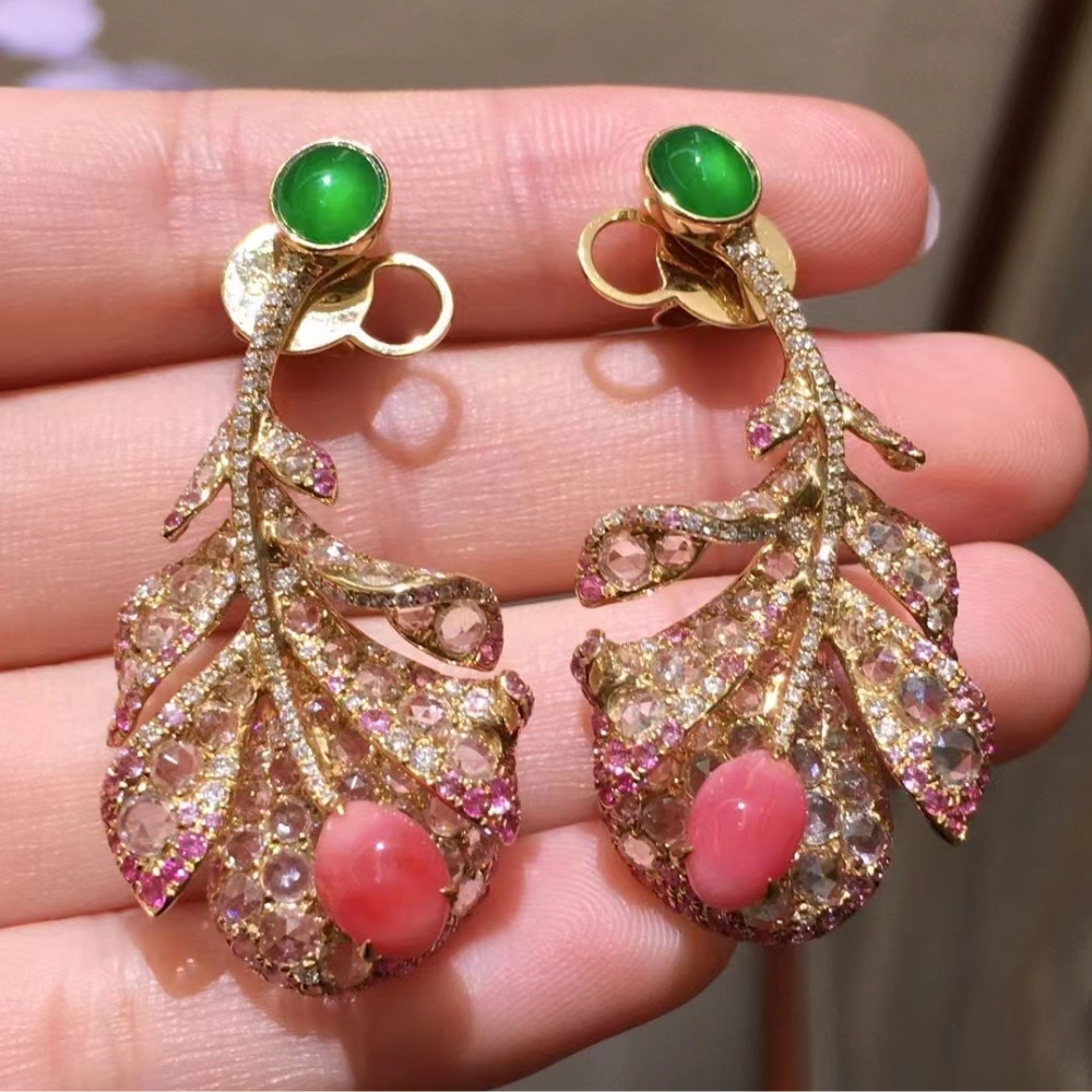 Description: These stunning feather drop earrings are designed for the goddess in you. Featuring rare seashell beads as the main stones, they are adorned with a gradient of pink diamonds that beautifully contrast with the vibrant green jadeite. Inspired by the elegance of feathers, these earrings sway gently as you move, exuding charm and lightness, and creating a striking visual impact. Elevate your look with this captivating piece that embodies nobility and grace.