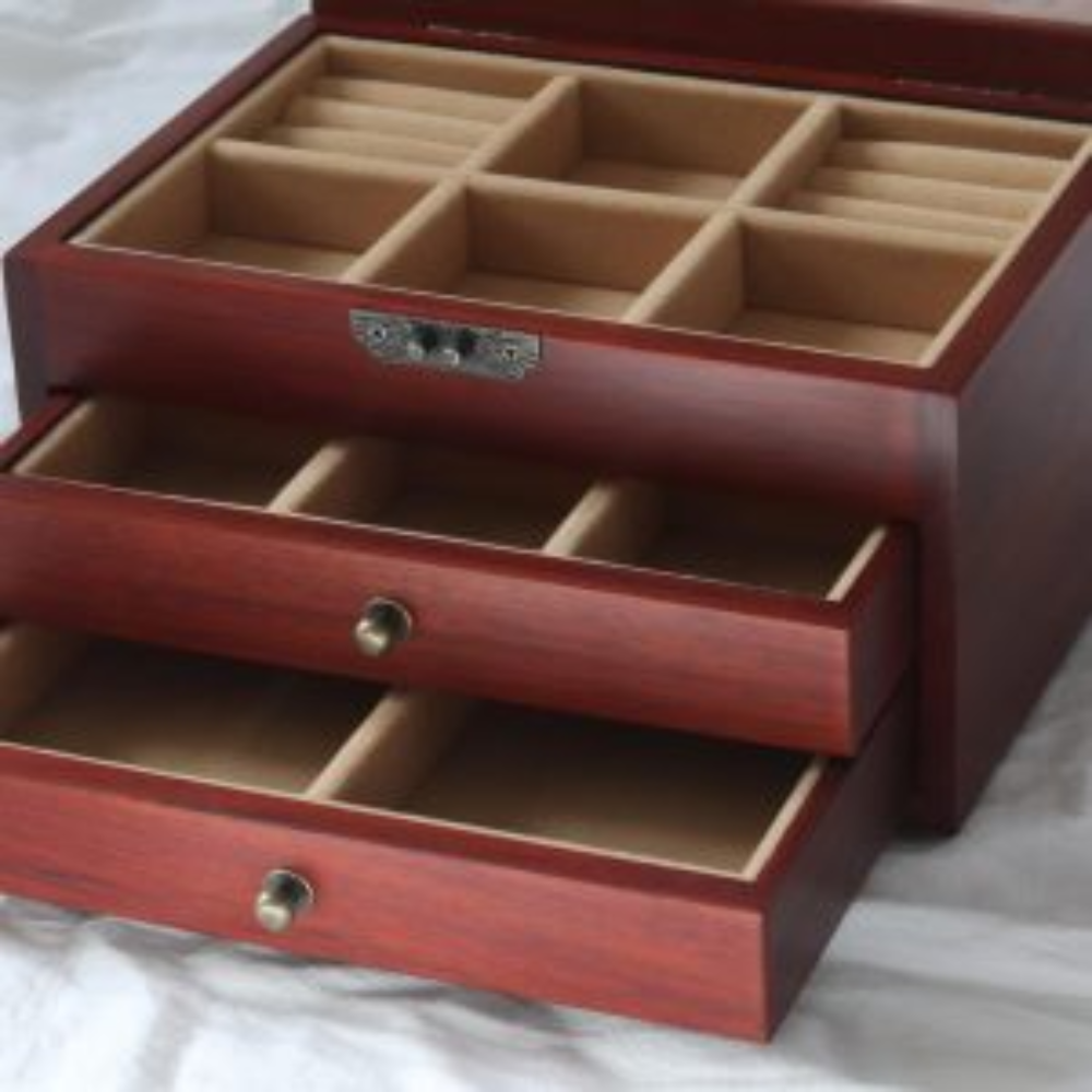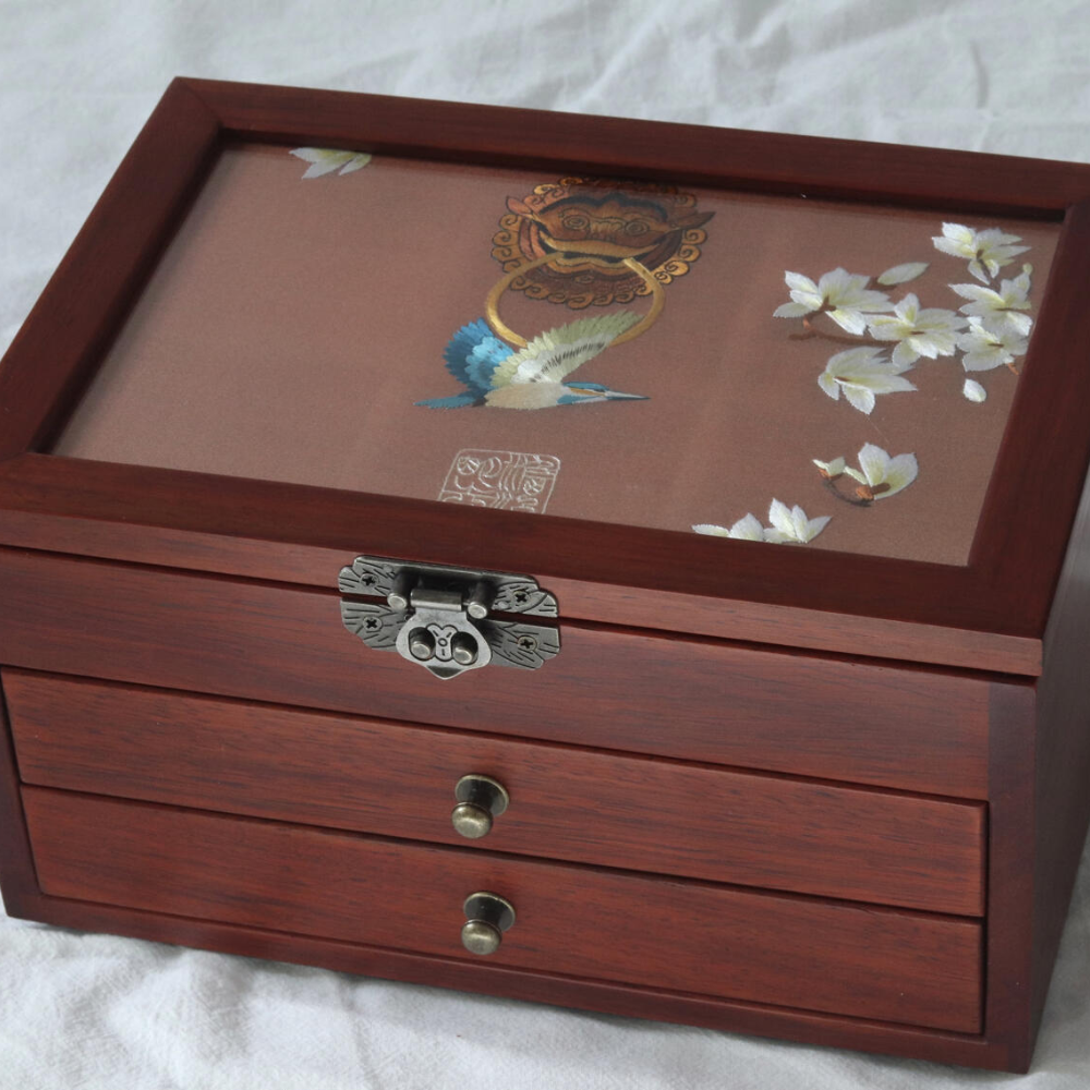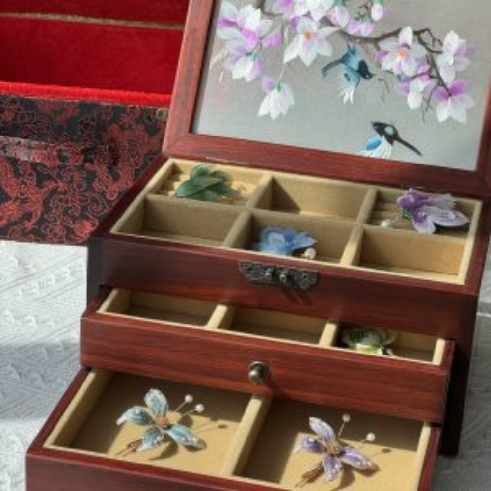 This exquisite jewelry box is crafted from premium red Huali wood, known for its rich texture and durability. It features a stunning, hand-embroidered silk cover, each pattern meticulously designed by our skilled artisan, making every box a unique work of art. With three spacious floors, this jewelry box offers ample storage for your precious pieces.