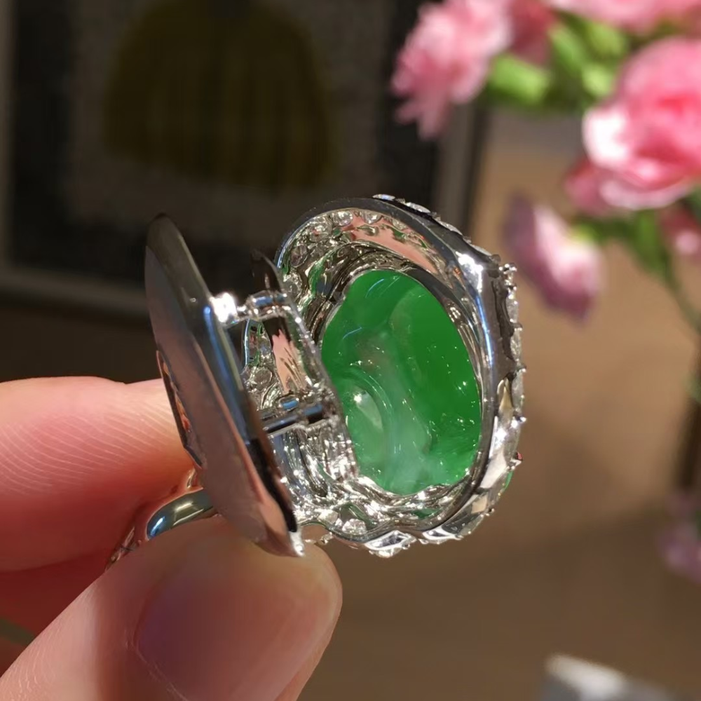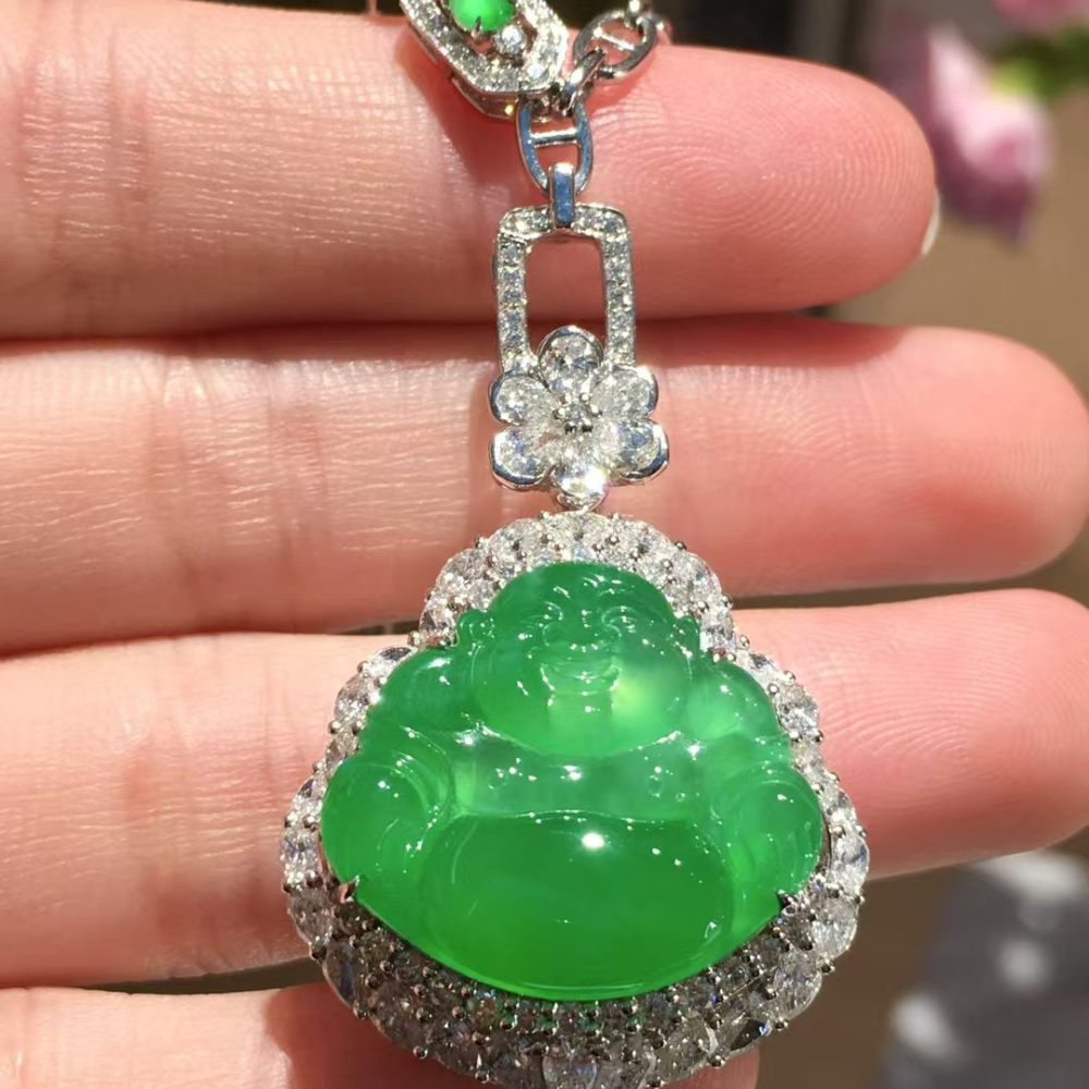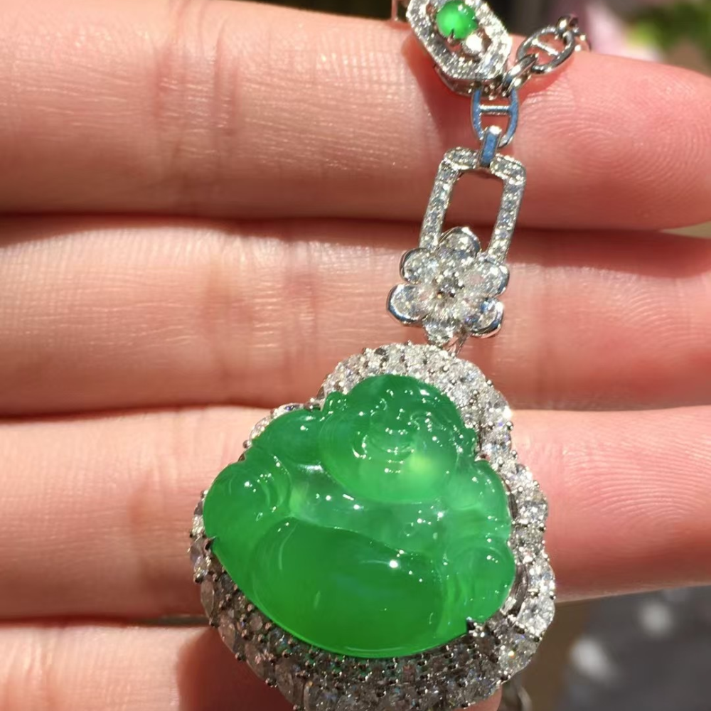 Material: Top-grade glassy green jadeite, with 18k white gold and diamonds. Origin: Myanmar Size of bare stone: 17.6203.5mm Size of finished product: 34.324.512mm Description:  This exquisite old mine glassy jadeite Maitreya Buddha features a vibrant sunlit green hue that catches the eye with its exceptional luster. With a flawless finish, this petite and delicate piece is perfect for high-end women seeking a charming accessory for daily wear. The Maitreya Buddha symbolizes good fortune and happiness, ensuring a positive outlook every day. Set in 18K white gold and adorned with diamonds, this pendant exudes luxury and grace.