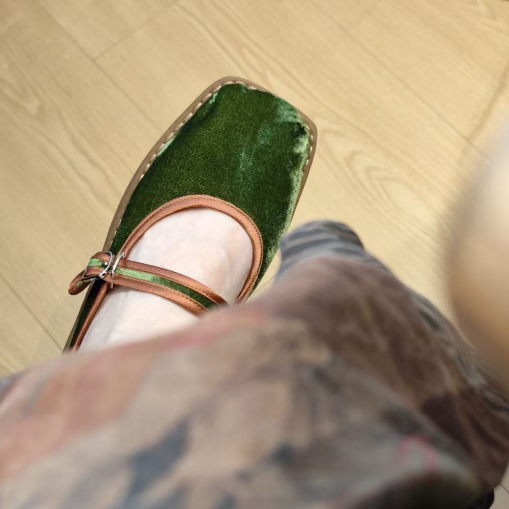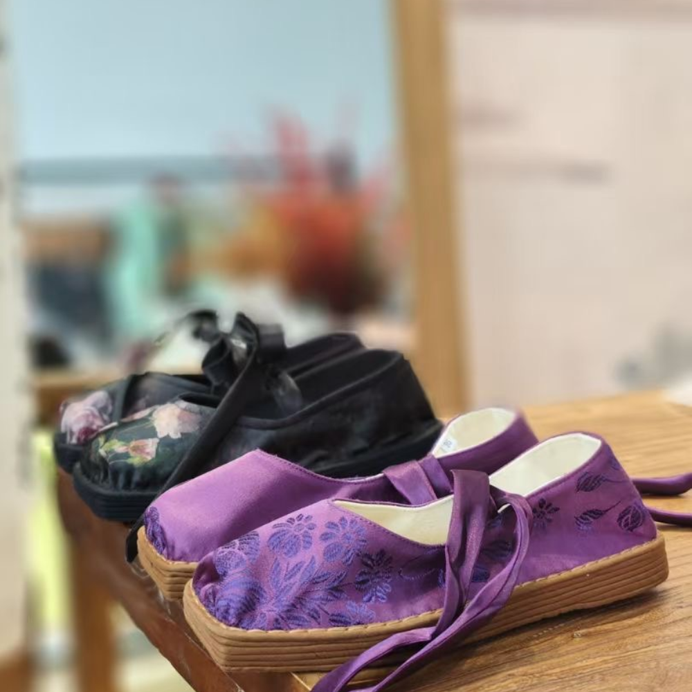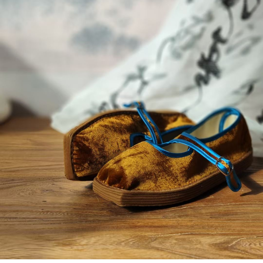 Our “Velvet Elegance” features a square-toe design, blending traditional Chinese aesthetics with subtle modern refinements. Crafted from luxurious silk and enhanced by a unique thousand-layer sole, these shoes offer timeless beauty, cultural heritage, and durability for outdoor wear. Inspired by nature’s serenity, they exude an ethereal elegance perfect for the discerning wearer.