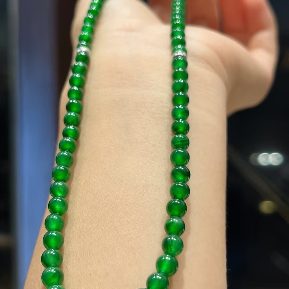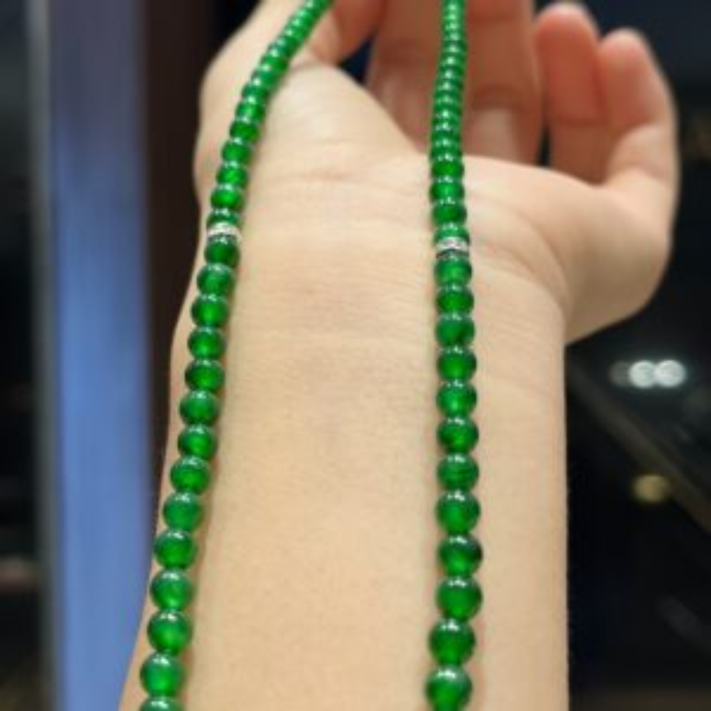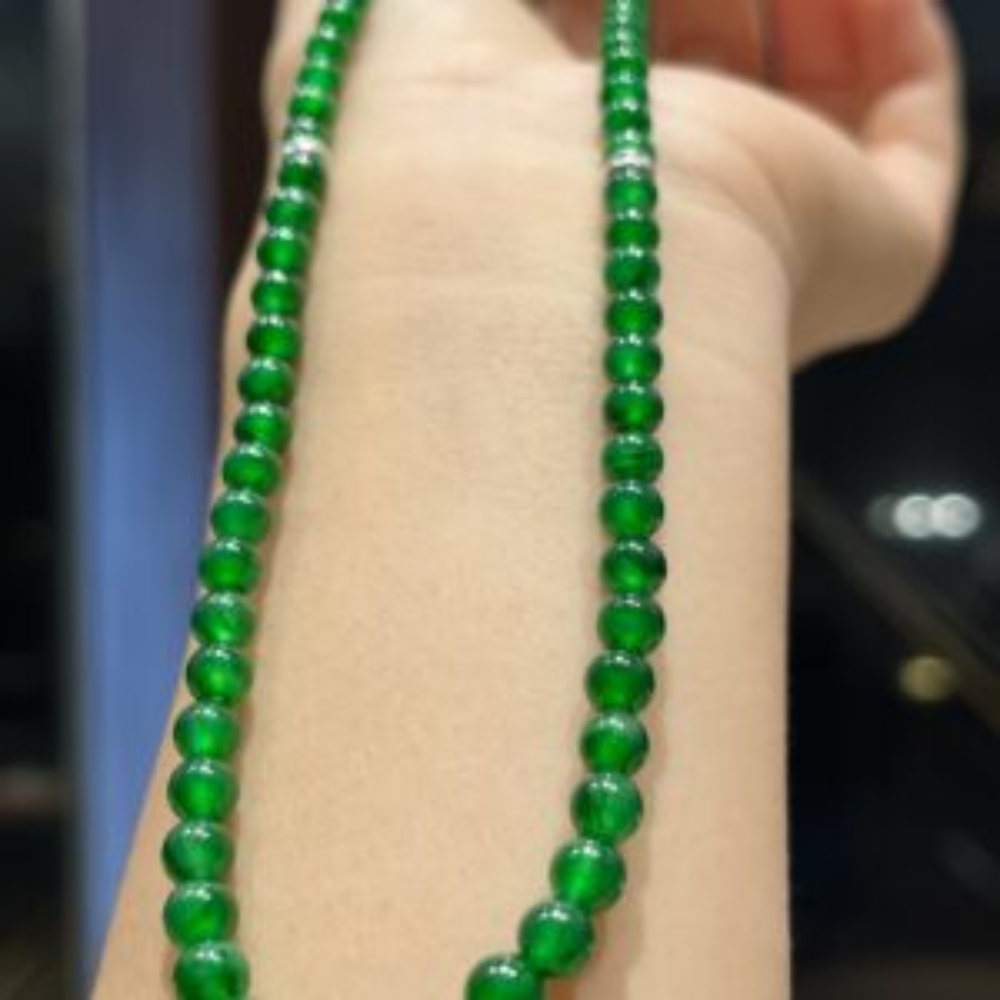 • Description:  This exquisite Vintage Imperial Green glassy jadeite necklace radiates a vibrant green hue that captivates in sunlight, showcasing its extraordinary luster. Delicately crafted, this petite piece is designed to enhance the wearer’s beauty while offering an elegant touch to any outfit. Each small yet top-quality bead is perfect for daily wear, making this necklace a timeless addition to your jewelry collection.